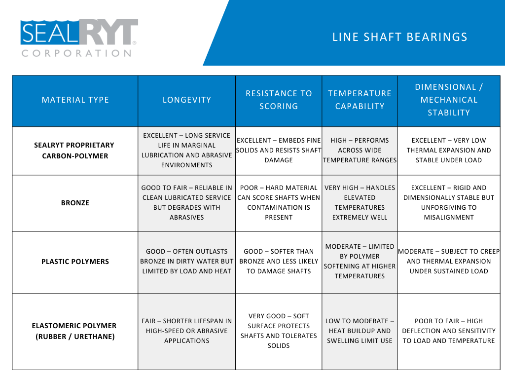 This balance of toughness and forgiveness is why carbon-polymer is often the safest choice for industrial and slurry applications. (Learn more about our Carbon-Polymer Line Shaft Bearings here)